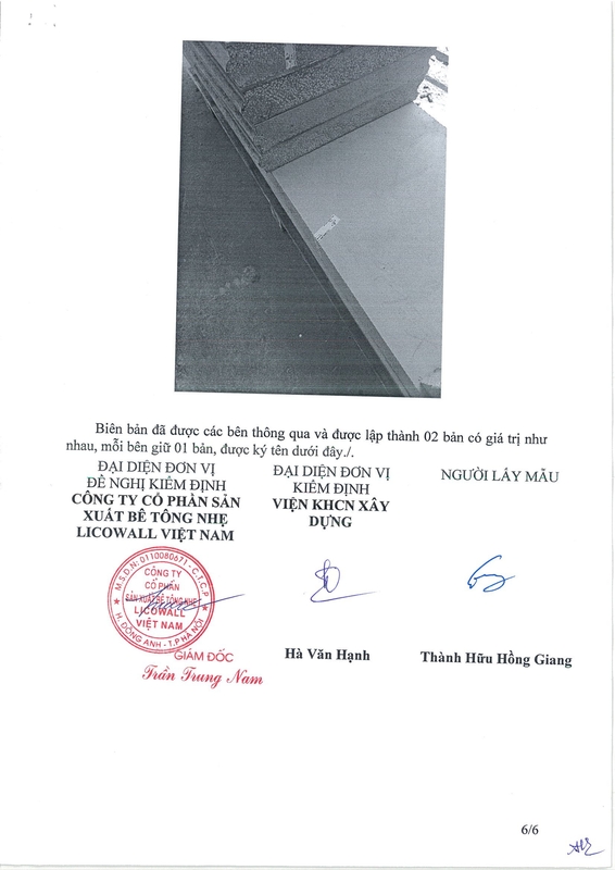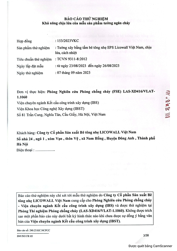 Báo cáo KQ thử nghiệm đốt EI90-100 Bê tông nhẹ Licowall Việt Nam